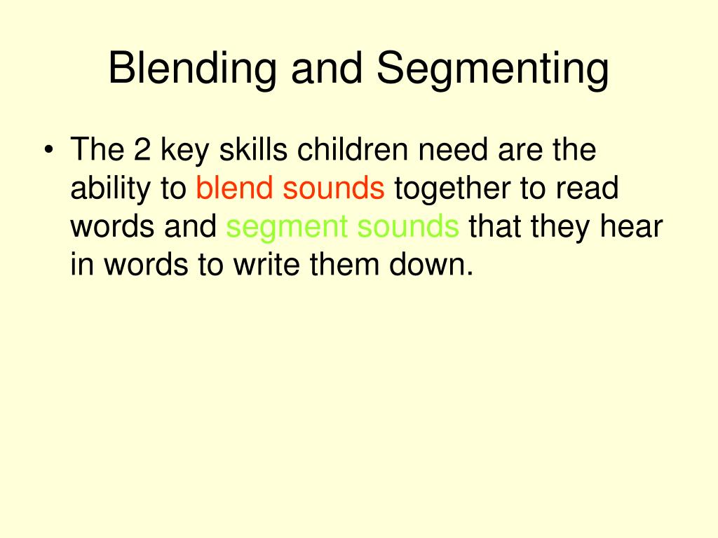 Blending and Segmenting • The 2 key skills children need are the ability to blend sounds together to read words and segment sounds that they hear in words to write them down.