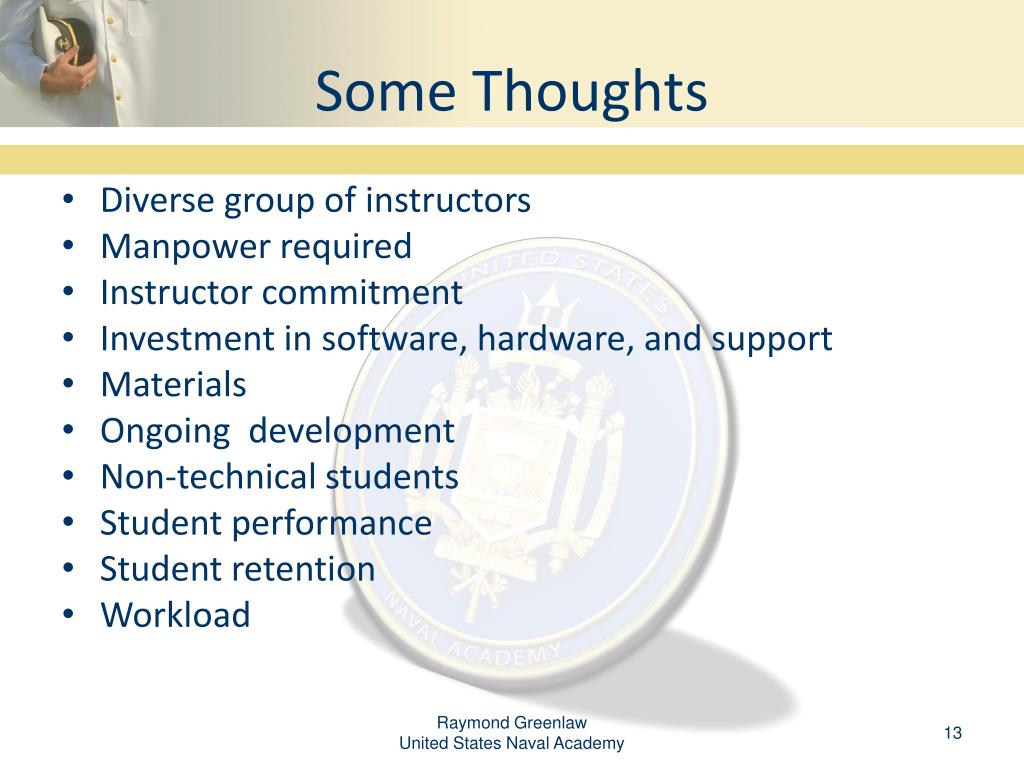 Some Thoughts Diverse group of instructors Manpower required Instructor commitment Investment in software, hardware, and support Materials Ongoing development Non-technical students Student performance Student retention Workload Raymond Greenlaw United States Naval Academy