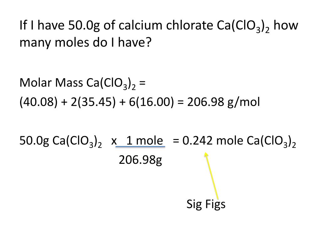 If I have 50.0g of calcium chlorate Ca(ClO3)2 how many moles do I have? Molar Mass Ca(ClO3)2 = (40.08) + 2(35.45) + 6(16.00) = 206.98 g/mol 50.0g Ca(ClO3)2 x 1 mole = 0.242 mole Ca(ClO3)2 206.98g Sig Figs