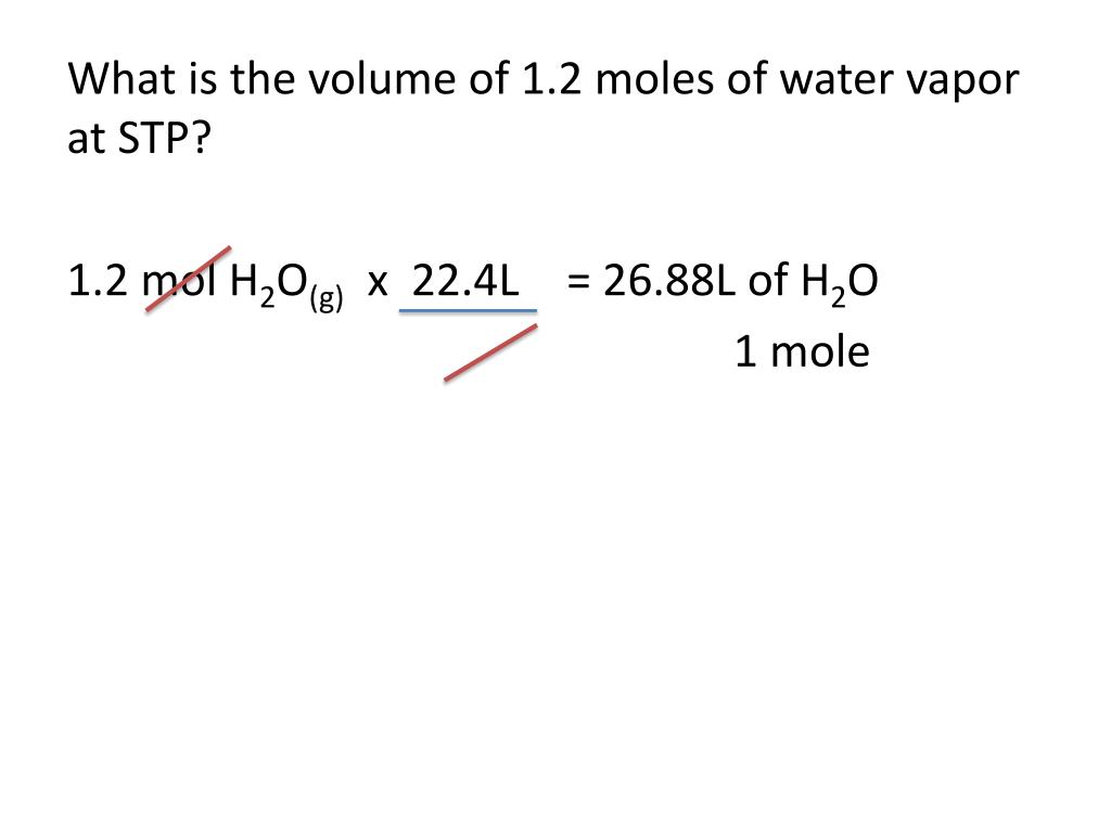 What is the volume of 1.2 moles of water vapor at STP? 1.2 mol H2O(g) x 22.4L = 26.88L of H2O 1 mole