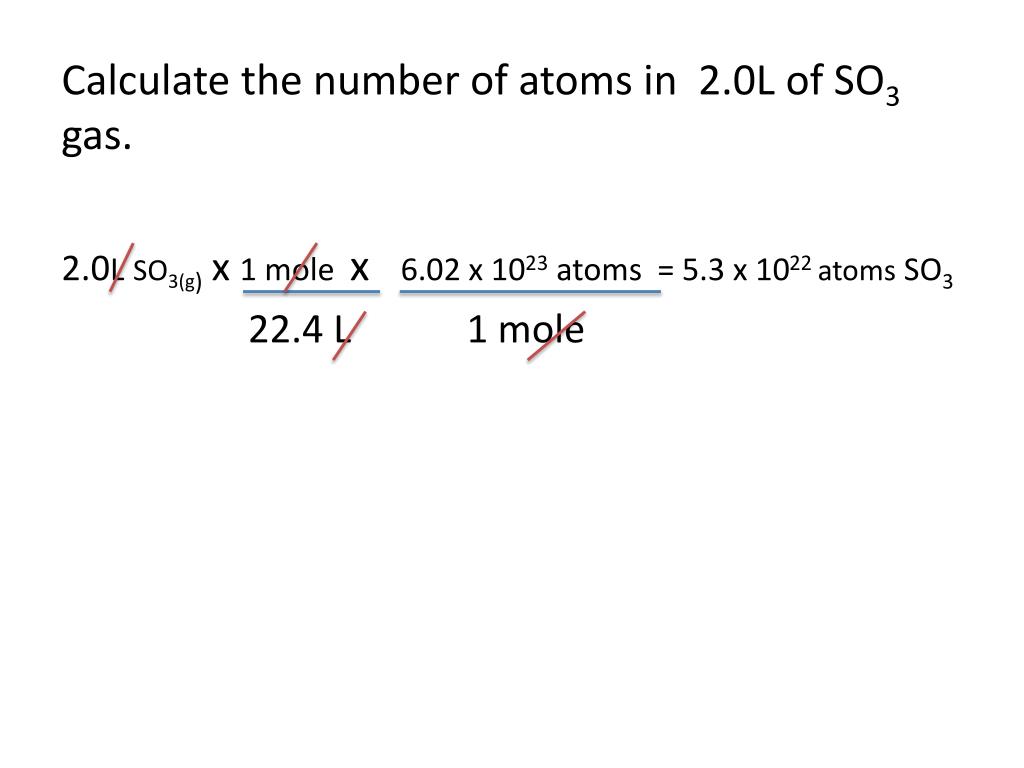 Calculate the number of atoms in 2.0L of SO3 gas. 2.0LSO3(g)x 1 mole x 6.02 x 1023 atoms = 5.3 x 1022 atoms SO3 22.4 L 1 mole