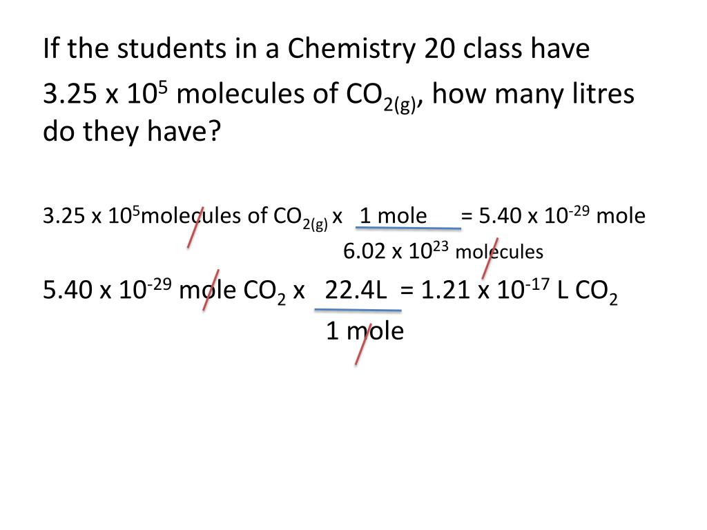If the students in a Chemistry 20 class have 3.25 x 105 molecules of CO2(g), how many litres do they have? 3.25 x 105molecules of CO2(g) x 1 mole = 5.40 x 10-29 mole 6.02 x 1023molecules 5.40 x 10-29 mole CO2 x 22.4L = 1.21 x 10-17 L CO2 1 mole