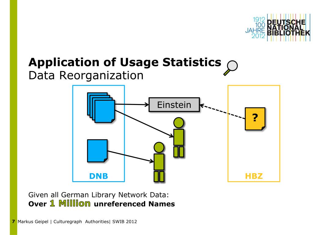 7 Application of Usage StatisticsData Reorganization DNB HBZ Given all German Library Network Data: Over 1 Million unreferenced Names Einstein Einstein ? Markus Geipel | Culturegraph Authorities| SWIB 2012
