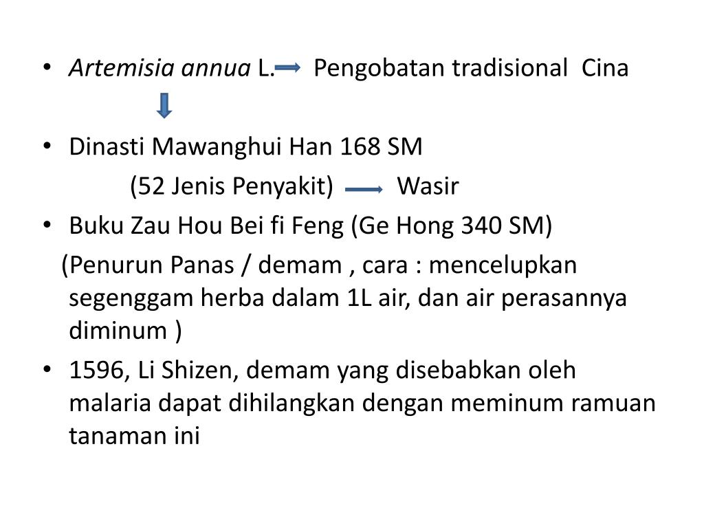 Artemisia annuaL. PengobatantradisionalCina • DinastiMawanghui Han 168 SM (52 JenisPenyakit) Wasir • BukuZauHouBeifiFeng (Ge Hong 340 SM) (PenurunPanas / demam , cara : mencelupkansegenggamherbadalam 1L air, dan air perasannyadiminum ) • 1596, Li Shizen, demam yang disebabkanoleh malaria dapatdihilangkandenganmeminumramuantanamanini