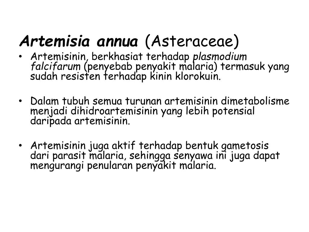 Artemisia annua(Asteraceae) • Artemisinin, berkhasiatterhadapplasmodium falcifarum(penyebabpenyakit malaria) termasuk yang sudahresistenterhadapkininklorokuin. • Dalamtubuhsemuaturunanartemisinindimetabolismemenjadidihidroartemisinin yang lebihpotensialdaripadaartemisinin. • Artemisininjugaaktifterhadapbentukgametosisdariparasit malaria, sehinggasenyawainijugadapatmengurangipenularanpenyakit malaria.