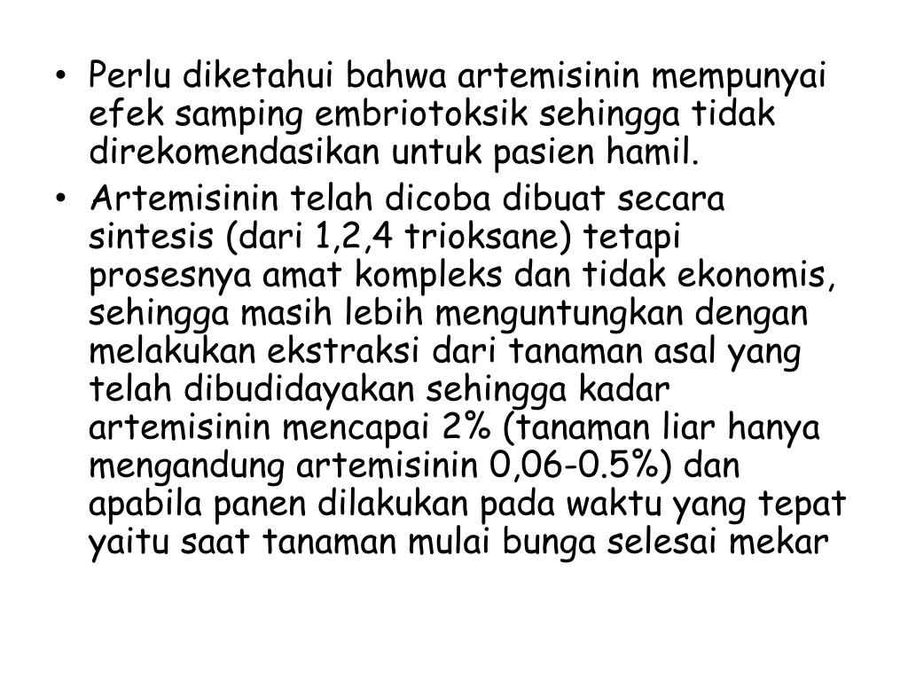 Perlu diketahui bahwa artemisinin mempunyai efek samping embriotoksik sehingga tidak direkomendasikan untuk pasien hamil. • Artemisinin telah dicoba dibuat secara sintesis (dari 1,2,4 trioksane) tetapi prosesnya amat kompleks dan tidak ekonomis, sehingga masih lebih menguntungkan dengan melakukan ekstraksi dari tanaman asal yang telah dibudidayakan sehingga kadar artemisinin mencapai 2% (tanaman liar hanya mengandung artemisinin 0,06-0.5%) dan apabila panen dilakukan pada waktu yang tepat yaitu saat tanaman mulai bunga selesai mekar