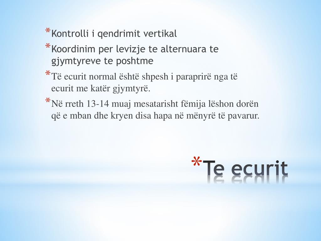 Kontrollii qendrimitvertikal • Koordinim per levizjetealternuarategjymtyreveteposhtme • Të ecurit normal është shpesh i paraprirë nga të ecurit me katër gjymtyrë. • Në rreth 13-14 muaj mesatarisht fëmija lëshon dorën që e mban dhe kryen disa hapa në mënyrë të pavarur. Teecurit