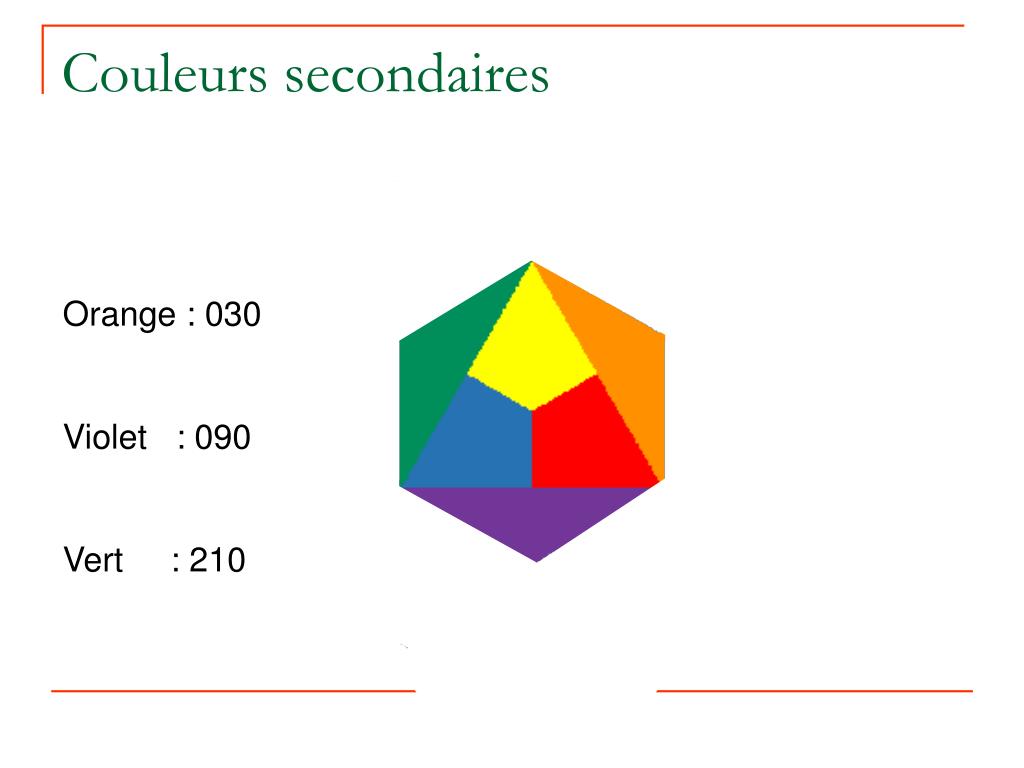Couleurs secondaires Orange : 030 Violet : 090 Vert : 210