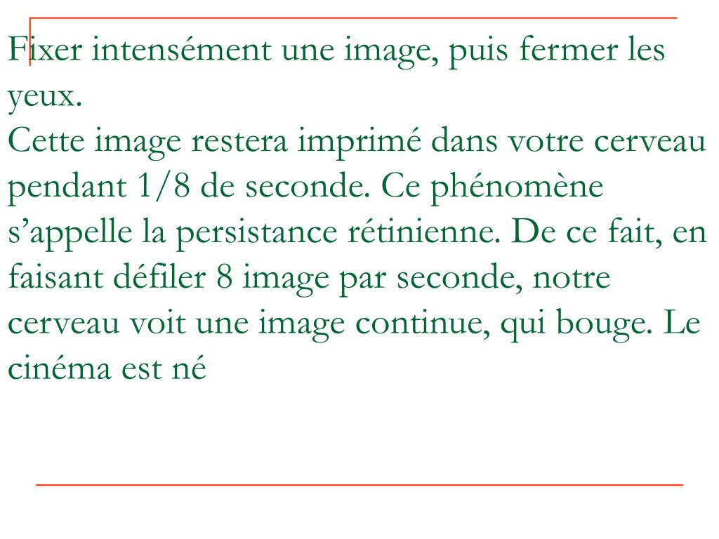 Fixer intensément une image, puis fermer les yeux. Cette image restera imprimé dans votre cerveau pendant 1/8 de seconde. Ce phénomène s’appelle la persistance rétinienne. De ce fait, en faisant défiler 8 image par seconde, notre cerveau voit une image continue, qui bouge. Le cinéma est né