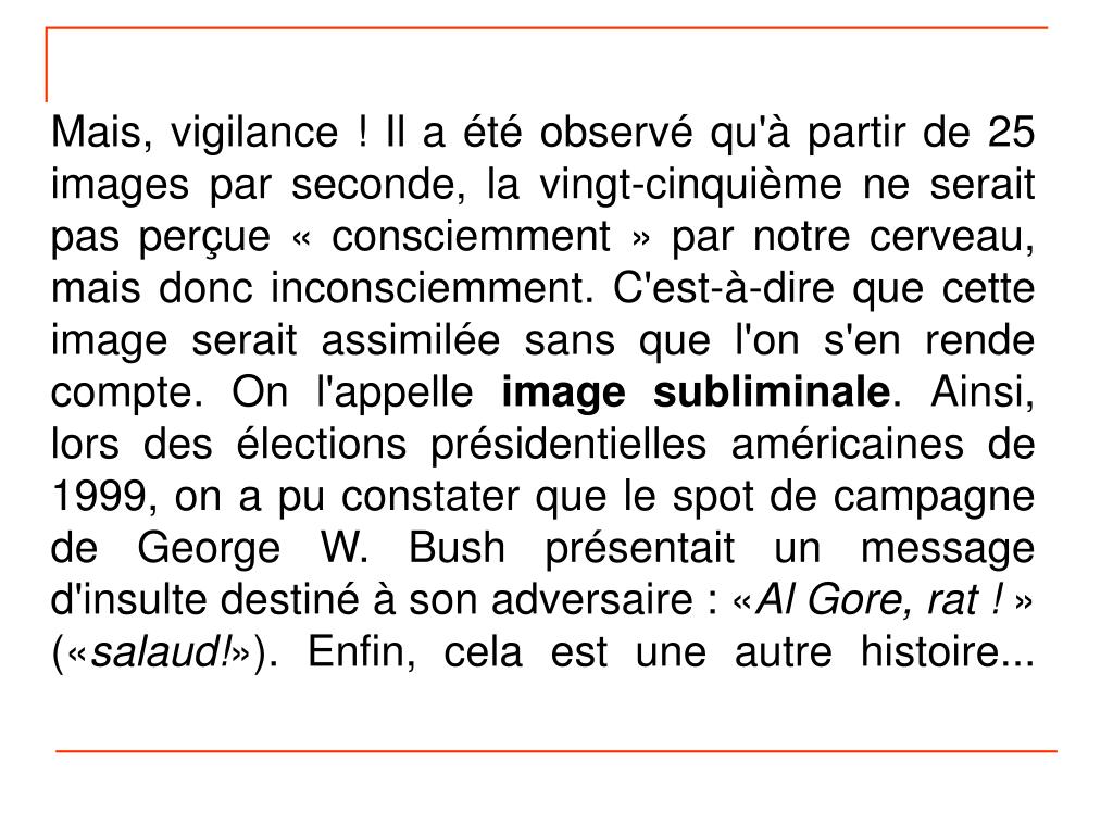 Mais, vigilance ! Il a été observé qu'à partir de 25 images par seconde, la vingt-cinquième ne serait pas perçue « consciemment » par notre cerveau, mais donc inconsciemment. C'est-à-dire que cette image serait assimilée sans que l'on s'en rende compte. On l'appelle image subliminale. Ainsi, lors des élections présidentielles américaines de 1999, on a pu constater que le spot de campagne de George W. Bush présentait un message d'insulte destiné à son adversaire : «Al Gore, rat ! » («salaud!»). Enfin, cela est une autre histoire...