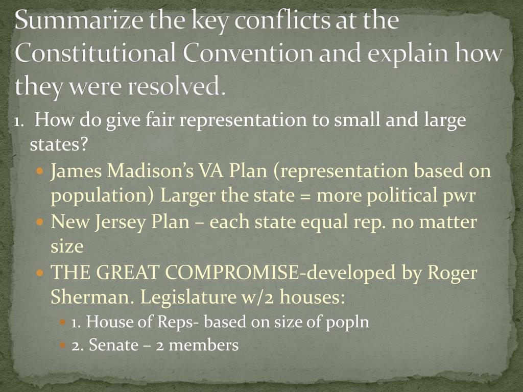 Summarize the key conflicts at the Constitutional Convention and explain how they were resolved. 1. How do give fair representation to small and large states? • James Madison’s VA Plan (representation based on population) Larger the state = more political pwr • New Jersey Plan – each state equal rep. no matter size • THE GREAT COMPROMISE-developed by Roger Sherman. Legislature w/2 houses: • 1. House of Reps- based on size of popln • 2. Senate – 2 members