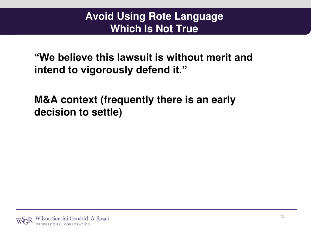 Avoid Using Rote Language Which Is Not True “We believe this lawsuit is without merit and intend to vigorously defend it.” M&A context (frequently there is an early decision to settle)