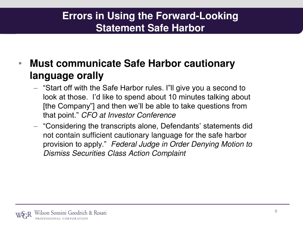 Errors in Using the Forward-Looking Statement Safe Harbor • Must communicate Safe Harbor cautionary language orally • “Start off with the Safe Harbor rules. I”ll give you a second to look at those. I’d like to spend about 10 minutes talking about [the Company”] and then we’ll be able to take questions from that point.” CFO at Investor Conference • “Considering the transcripts alone, Defendants’ statements did not contain sufficient cautionary language for the safe harbor provision to apply.” Federal Judge in Order Denying Motion to Dismiss Securities Class Action Complaint