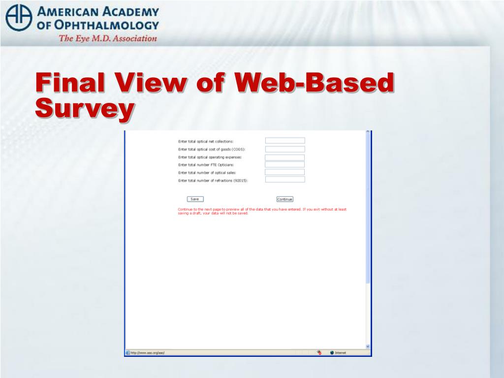 Task Force on Eye Care Delivery • The Benchmarking Survey came about as a recommendation from the Academy’s Task Force on Eye Care Delivery, recognizing members will need benchmarking data with which to make decisions: • Preparing their practices for Baby Boomers • Anticipating other changing economic and demographic factors