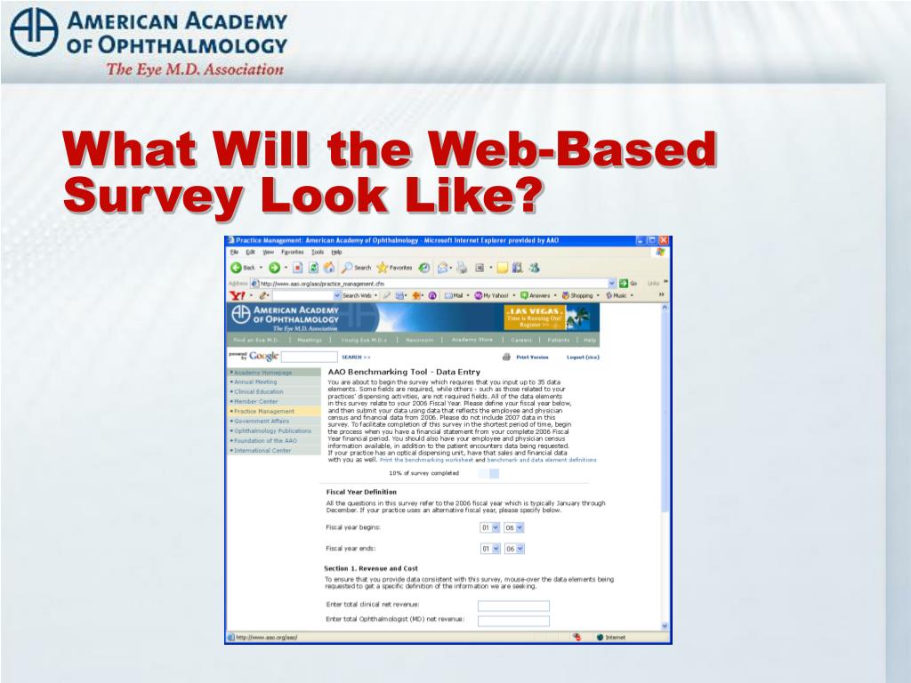 To Enroll in the Pilot • In order to join, go to the Academy Web site at http://www.aao.org/pilot_registration/ and log in • Fill out the information in the demographic forms and submit • Your designated data respondent will receive a confirmation with the benchmarking log in at the email you provide • We will issue you an invitation to fill out the survey in Summer 07 • If at any time you have questions or comments, please contact us at benchmarking@aao.org