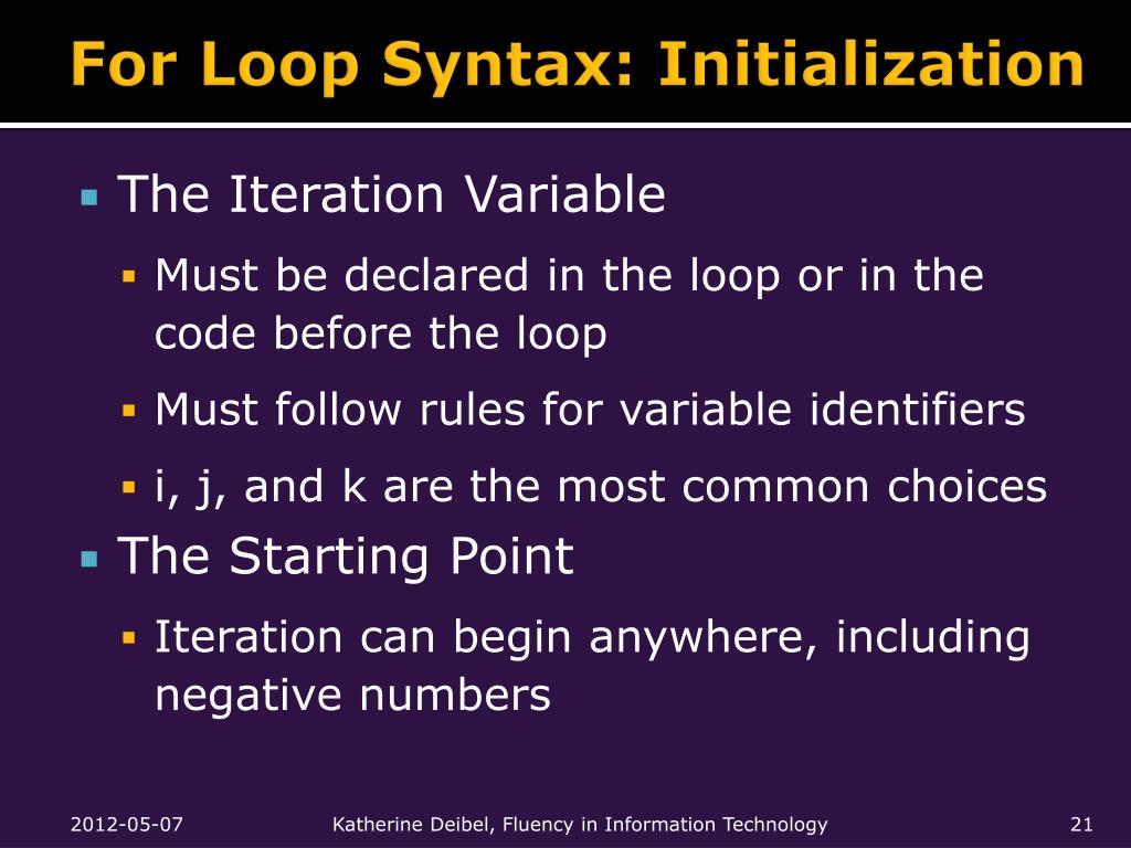 For Loop Syntax: Initialization • The Iteration Variable • Must be declared in the loop or in the code before the loop • Must follow rules for variable identifiers • i, j, and k are the most common choices • The Starting Point • Iteration can begin anywhere, including negative numbers Katherine Deibel, Fluency in Information Technology
