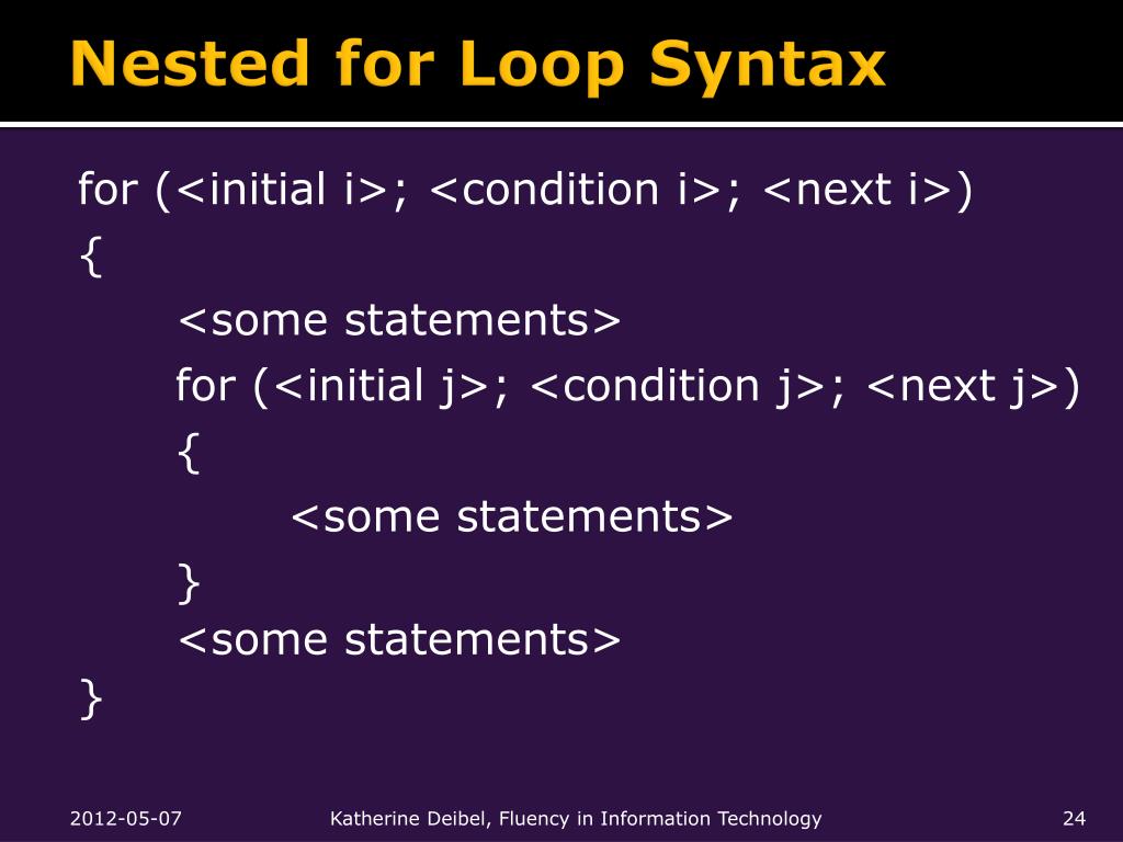Nested for Loop Syntax for (<initial i>; <condition i>; <next i>) { <some statements> for (<initial j>; <condition j>; <next j>) { <some statements> } <some statements> } Katherine Deibel, Fluency in Information Technology