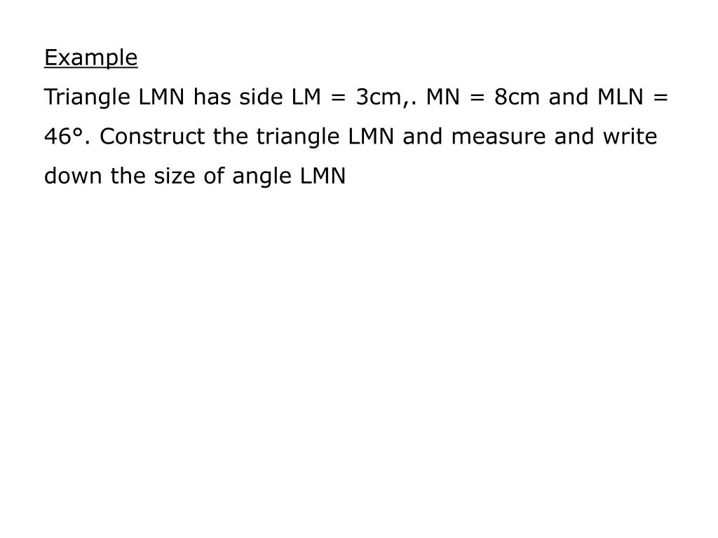 Example Triangle LMN has side LM = 3cm,. MN = 8cm and MLN = 46°. Construct the triangle LMN and measure and write down the size of angle LMN