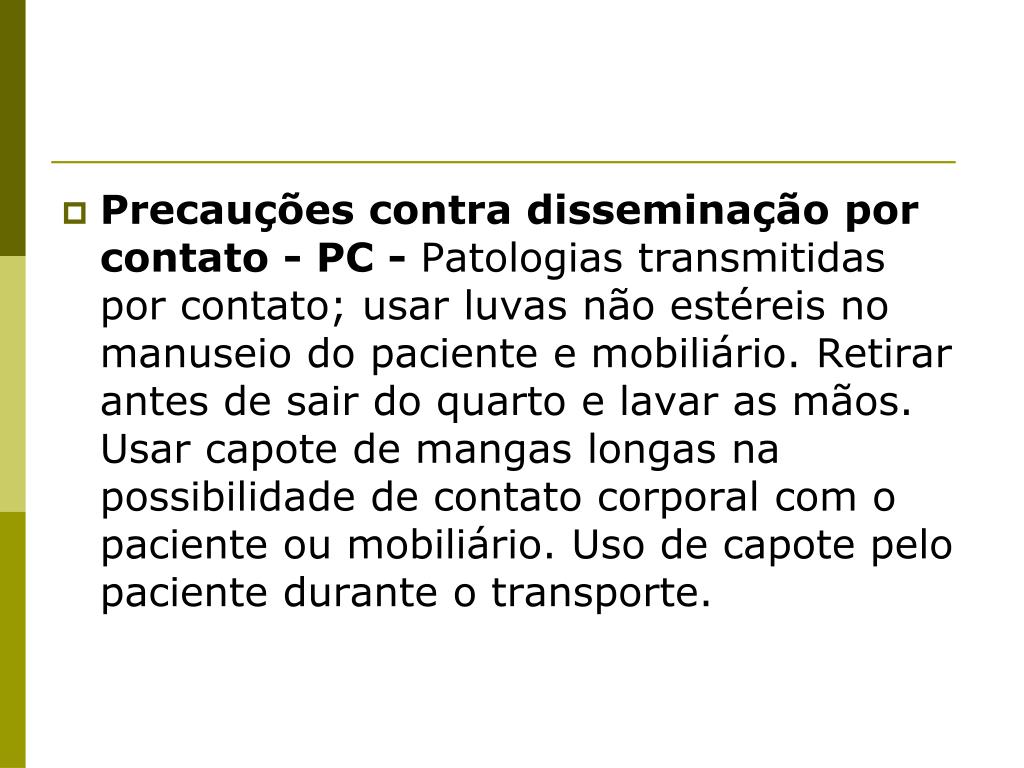 Precauções contra disseminação por contato - PC - Patologias transmitidas por contato; usar luvas não estéreis no manuseio do paciente e mobiliário. Retirar antes de sair do quarto e lavar as mãos. Usar capote de mangas longas na possibilidade de contato corporal com o paciente ou mobiliário. Uso de capote pelo paciente durante o transporte.