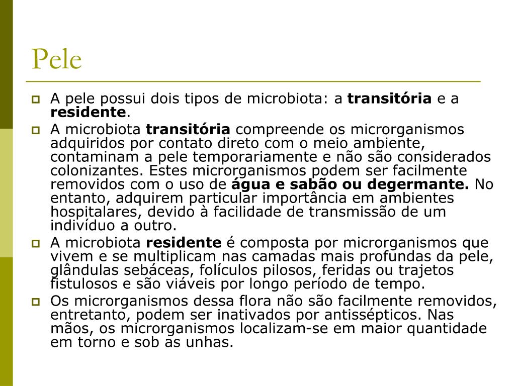 Pele • A pele possui dois tipos de microbiota: a transitória e a residente. • A microbiota transitória compreende os microrganismos adquiridos por contato direto com o meio ambiente, contaminam a pele temporariamente e não são considerados colonizantes. Estes microrganismos podem ser facilmente removidos com o uso de água e sabão ou degermante. No entanto, adquirem particular importância em ambientes hospitalares, devido à facilidade de transmissão de um indivíduo a outro. • A microbiota residente é composta por microrganismos que vivem e se multiplicam nas camadas mais profundas da pele, glândulas sebáceas, folículos pilosos, feridas ou trajetos fistulosos e são viáveis por longo período de tempo. • Os microrganismos dessa flora não são facilmente removidos, entretanto, podem ser inativados por antissépticos. Nas mãos, os microrganismos localizam-se em maior quantidade em torno e sob as unhas.