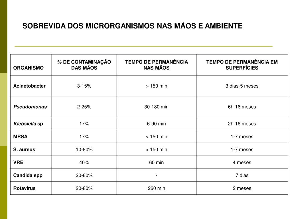 Lavagem das mãos lavagem básica das mãos; • esse procedimento objetiva a remoção da maioria da flora transitória bem como de sujidades células descamativas, oleosidades, suor, pêlos ,e alguns microorganismos da pele • Remover os microrganismos que colonizam as camadas superficiais da pele, assim como o suor, a oleosidade e as células mortas, retirando a sujidade propícia à permanência e à proliferação de microrganismos.Duração do procedimento: 40 a 60 segundos. (ANVISA)