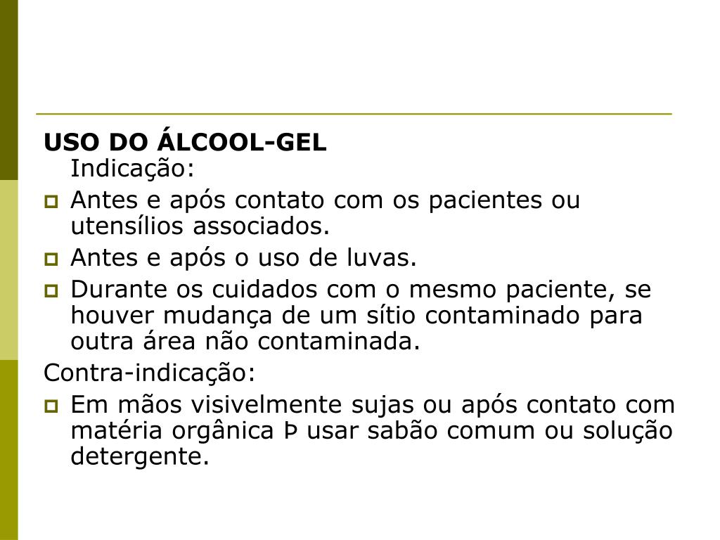 USO DO ÁLCOOL-GELIndicação: • Antes e após contato com os pacientes ou utensílios associados. • Antes e após o uso de luvas. • Durante os cuidados com o mesmo paciente, se houver mudança de um sítio contaminado para outra área não contaminada. Contra-indicação: • Em mãos visivelmente sujas ou após contato com matéria orgânica Þ usar sabão comum ou solução detergente.