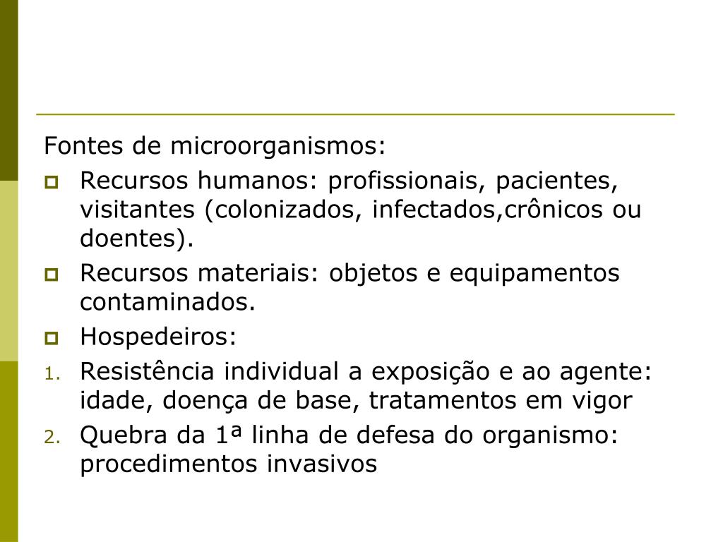 Fontes de microorganismos: • Recursos humanos: profissionais, pacientes, visitantes (colonizados, infectados,crônicos ou doentes). • Recursos materiais: objetos e equipamentos contaminados. • Hospedeiros: • Resistência individual a exposição e ao agente: idade, doença de base, tratamentos em vigor • Quebra da 1ª linha de defesa do organismo: procedimentos invasivos