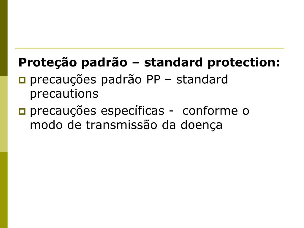 Proteção padrão – standard protection: • precauções padrão PP – standard precautions • precauções específicas - conforme o modo de transmissão da doença