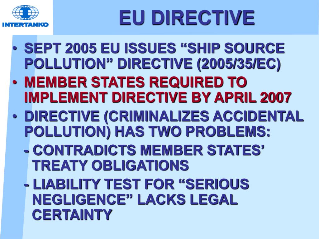EU DIRECTIVE • SEPT 2005 EU ISSUES “SHIP SOURCE POLLUTION” DIRECTIVE (2005/35/EC) • MEMBER STATES REQUIRED TO IMPLEMENT DIRECTIVE BY APRIL 2007 • DIRECTIVE (CRIMINALIZES ACCIDENTAL POLLUTION) HAS TWO PROBLEMS: - CONTRADICTS MEMBER STATES’ TREATY OBLIGATIONS - LIABILITY TEST FOR “SERIOUS NEGLIGENCE” LACKS LEGAL CERTAINTY