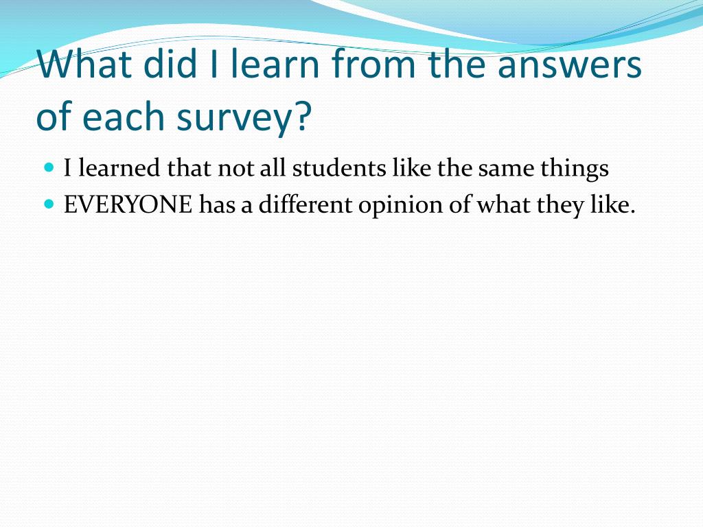 What did I learn from the answers of each survey? • I learned that not all students like the same things • EVERYONE has a different opinion of what they like.