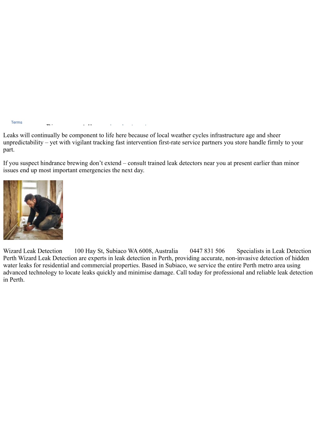Terms Thi t d b L h t t Leaks will continually be component to life here because of local weather cycles infrastructure age and sheer unpredictability – yet with vigilant tracking fast intervention first-rate service partners you store handle firmly to your part. If you suspect hindrance brewing don’t extend – consult trained leak detectors near you at present earlier than minor issues end up most important emergencies the next day. Wizard Leak Detection Perth Wizard Leak Detection are experts in leak detection in Perth, providing accurate, non-invasive detection of hidden water leaks for residential and commercial properties. Based in Subiaco, we service the entire Perth metro area using advanced technology to locate leaks quickly and minimise damage. Call today for professional and reliable leak detection in Perth. 100 Hay St, Subiaco WA 6008, Australia 0447 831 506 Specialists in Leak Detection