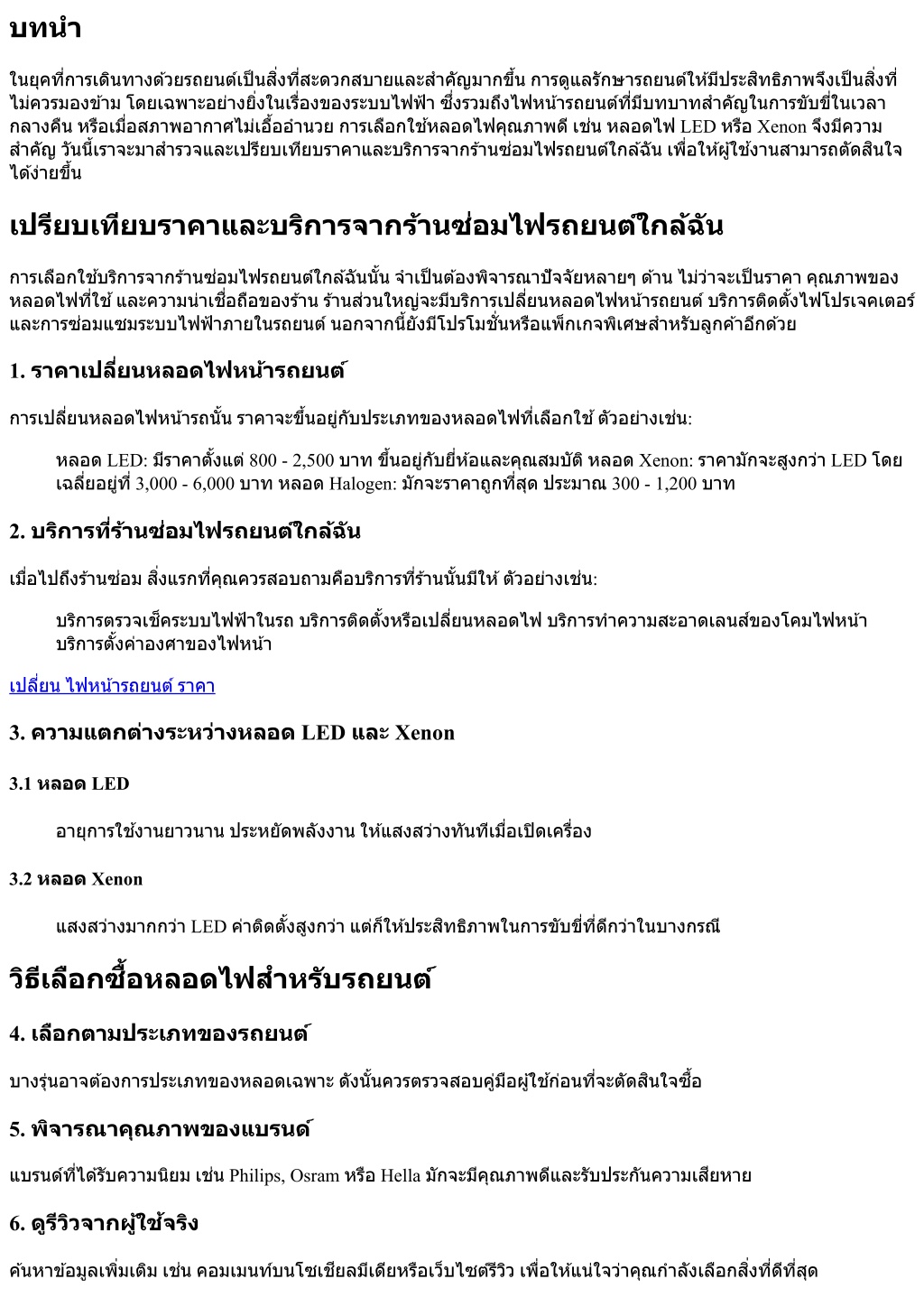1. บทนํา ในยุคที?การเดินทางด้วยรถยนต์เป็นสิ?งที?สะดวกสบายและสําคัญมากขึ?นการดูแลรักษารถยนต์ให้มีประสิทธิภาพจึงเป็นสิ?งที? ไม่ควรมองข้ามโดยเฉพาะอย่างยิ?งในเรื?องของระบบไฟฟ้าซึ?งรวมถึงไฟหน้ารถยนต์ที?มีบทบาทสําคัญในการขับขี?ในเวลา กลางคืนหรือเมื?อสภาพอากาศไม่เอื?ออํานวยการเลือกใช้หลอดไฟคุณภาพดีเช่นหลอดไฟ LED หรือ Xenon จึงมีความ สําคัญวันนี?เราจะมาสํารวจและเปรียบเทียบราคาและบริการจากร้านซ่อมไฟรถยนต์ใกล้ฉันเพื?อให้ผู้ใช้งานสามารถตัดสินใจ ได้ง่ายขึ?น เปรียบเทียบราคาและบริการจากร้านซ่อมไฟรถยนต์ใกล้ฉัน การเลือกใช้บริการจากร้านซ่อมไฟรถยนต์ใกล้ฉันนั?นจําเป็นต้องพิจารณาปัจจัยหลายๆด้านไม่ว่าจะเป็นราคาคุณภาพของ หลอดไฟที?ใช้และความน่าเชื?อถือของร้านร้านส่วนใหญ่จะมีบริการเปลี?ยนหลอดไฟหน้ารถยนต์บริการติดตั?งไฟโปรเจคเตอร์ และการซ่อมแซมระบบไฟฟ้าภายในรถยนต์นอกจากนี?ยังมีโปรโมชั?นหรือแพ็กเกจพิเศษสําหรับลูกค้าอีกด้วย 1. ราคาเปลี?ยนหลอดไฟหน้ารถยนต์ การเปลี?ยนหลอดไฟหน้ารถนั?นราคาจะขึ?นอยู่กับประเภทของหลอดไฟที?เลือกใช้ตัวอย่างเช่น: หลอด LED: มีราคาตั?งแต่ 800 - 2,500 บาทขึ?นอยู่กับยี?ห้อและคุณสมบัติหลอด Xenon: ราคามักจะสูงกว่า LED โดย เฉลี?ยอยู่ที? 3,000 - 6,000 บาทหลอด Halogen: มักจะราคาถูกที?สุดประมาณ 300 - 1,200 บาท 2. บริการที?ร้านซ่อมไฟรถยนต์ใกล้ฉัน เมื?อไปถึงร้านซ่อมสิ?งแรกที?คุณควรสอบถามคือบริการที?ร้านนั?นมีให้ตัวอย่างเช่น: บริการตรวจเช็คระบบไฟฟ้าในรถบริการติดตั?งหรือเปลี?ยนหลอดไฟบริการทําความสะอาดเลนส์ของโคมไฟหน้า บริการตั?งค่าองศาของไฟหน้า เปลี?ยนไฟหน้ารถยนต์ราคา 3. ความแตกต่างระหว่างหลอด LED และ Xenon 3.1 หลอด LED อายุการใช้งานยาวนานประหยัดพลังงานให้แสงสว่างทันทีเมื?อเปิดเครื?อง 3.2 หลอด Xenon แสงสว่างมากกว่า LED ค่าติดตั?งสูงกว่าแต่ก็ให้ประสิทธิภาพในการขับขี?ที?ดีกว่าในบางกรณี วิธีเลือกซื?อหลอดไฟสําหรับรถยนต์ 4. เลือกตามประเภทของรถยนต์ บางรุ่นอาจต้องการประเภทของหลอดเฉพาะดังนั?นควรตรวจสอบคู่มือผู้ใช้ก่อนที?จะตัดสินใจซื?อ 5. พิจารณาคุณภาพของแบรนด์ แบรนด์ที?ได้รับความนิยมเช่น Philips, Osram หรือ Hella มักจะมีคุณภาพดีและรับประกันความเสียหาย 6. ดูรีวิวจากผู้ใช้จริง ค้นหาข้อมูลเพิ?มเติมเช่นคอมเมนท์บนโซเชียลมีเดียหรือเว็บไซต์รีวิวเพื?อให้แน่ใจว่าคุณกําลังเลือกสิ?งที?ดีที?สุด