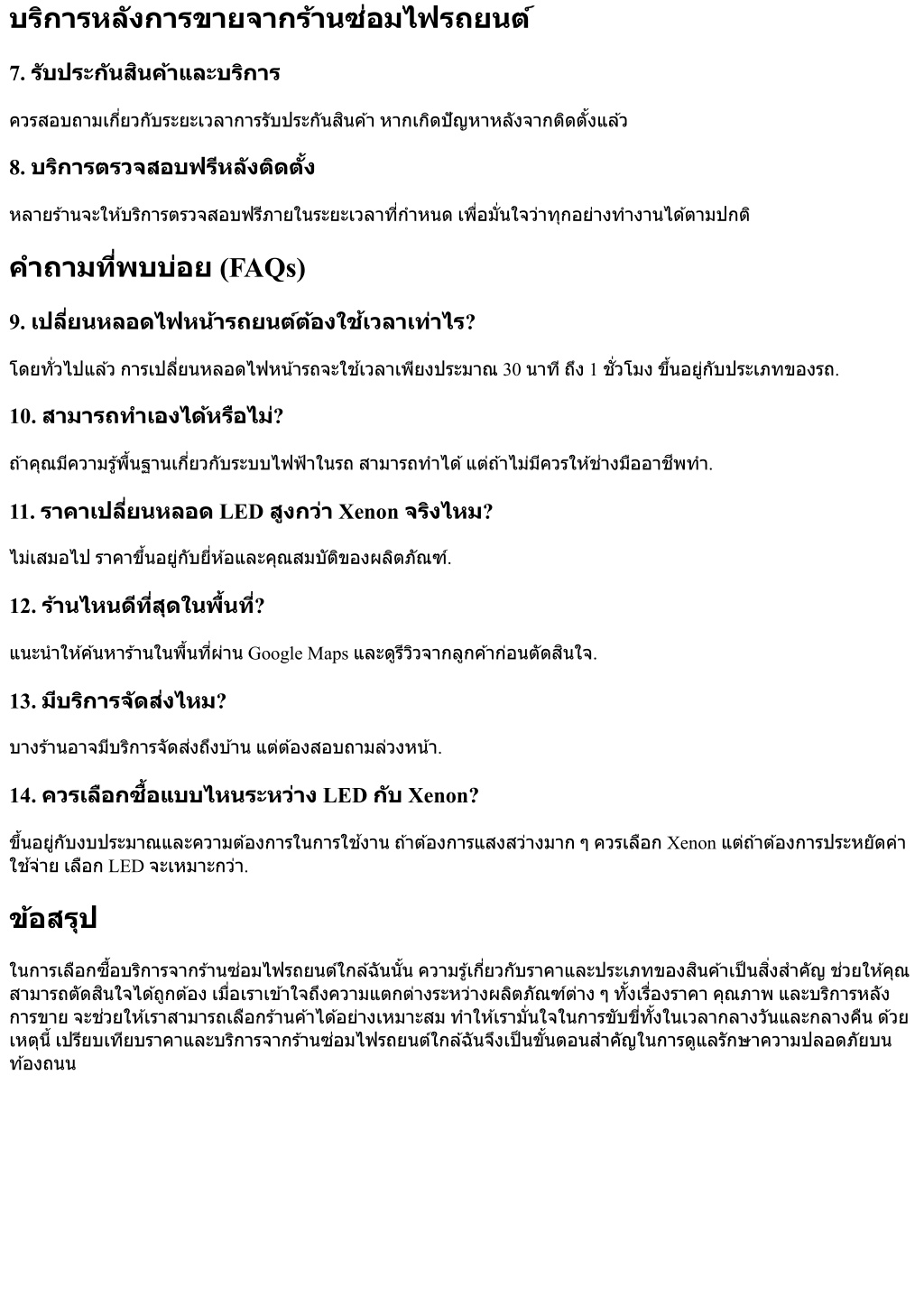 2. บริการหลังการขายจากร้านซ่อมไฟรถยนต์บริการหลังการขายจากร้านซ่อมไฟรถยนต์ 7. รับประกันสินค้าและบริการ ควรสอบถามเกี?ยวกับระยะเวลาการรับประกันสินค้าหากเกิดปัญหาหลังจากติดตั?งแล้ว 8. บริการตรวจสอบฟรีหลังติดตั?ง หลายร้านจะให้บริการตรวจสอบฟรีภายในระยะเวลาที?กําหนดเพื?อมั?นใจว่าทุกอย่างทํางานได้ตามปกติ คําถามที?พบบ่อย (FAQs) 9. เปลี?ยนหลอดไฟหน้ารถยนต์ต้องใช้เวลาเท่าไร? โดยทั?วไปแล้วการเปลี?ยนหลอดไฟหน้ารถจะใช้เวลาเพียงประมาณ 30 นาทีถึง 1 ชั?วโมงขึ?นอยู่กับประเภทของรถ. 10. สามารถทําเองได้หรือไม่? ถ้าคุณมีความรู้พื?นฐานเกี?ยวกับระบบไฟฟ้าในรถสามารถทําได้แต่ถ้าไม่มีควรให้ช่างมืออาชีพทํา. 11. ราคาเปลี?ยนหลอด LED สูงกว่า Xenon จริงไหม? ไม่เสมอไปราคาขึ?นอยู่กับยี?ห้อและคุณสมบัติของผลิตภัณฑ์. 12. ร้านไหนดีที?สุดในพื?นที?? แนะนําให้ค้นหาร้านในพื?นที?ผ่าน Google Maps และดูรีวิวจากลูกค้าก่อนตัดสินใจ. 13. มีบริการจัดส่งไหม? บางร้านอาจมีบริการจัดส่งถึงบ้านแต่ต้องสอบถามล่วงหน้า. 14. ควรเลือกซื?อแบบไหนระหว่าง LED กับ Xenon? ขึ?นอยู่กับงบประมาณและความต้องการในการใช้งานถ้าต้องการแสงสว่างมากๆควรเลือก Xenon แต่ถ้าต้องการประหยัดค่า ใช้จ่ายเลือก LED จะเหมาะกว่า. ข้อสรุป ในการเลือกซื?อบริการจากร้านซ่อมไฟรถยนต์ใกล้ฉันนั?นความรู้เกี?ยวกับราคาและประเภทของสินค้าเป็นสิ?งสําคัญช่วยให้คุณ สามารถตัดสินใจได้ถูกต้องเมื?อเราเข้าใจถึงความแตกต่างระหว่างผลิตภัณฑ์ต่างๆทั?งเรื?องราคาคุณภาพและบริการหลัง การขายจะช่วยให้เราสามารถเลือกร้านค้าได้อย่างเหมาะสมทําให้เรามั?นใจในการขับขี?ทั?งในเวลากลางวันและกลางคืนด้วย เหตุนี?เปรียบเทียบราคาและบริการจากร้านซ่อมไฟรถยนต์ใกล้ฉันจึงเป็นขั?นตอนสําคัญในการดูแลรักษาความปลอดภัยบน ท้องถนน