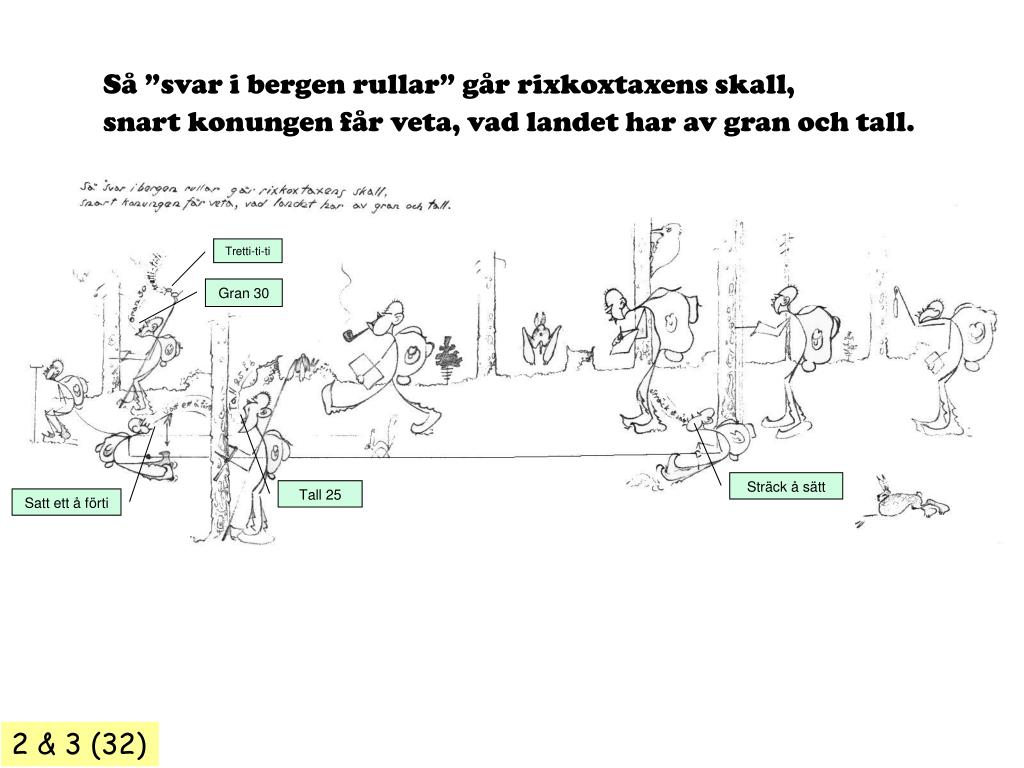 Så ”svar i bergen rullar” går rixkoxtaxens skall, snart konungen får veta, vad landet har av gran och tall. Tretti-ti-ti Gran 30 Sträck å sätt Tall 25 Satt ett å förti 2 & 3 (32)