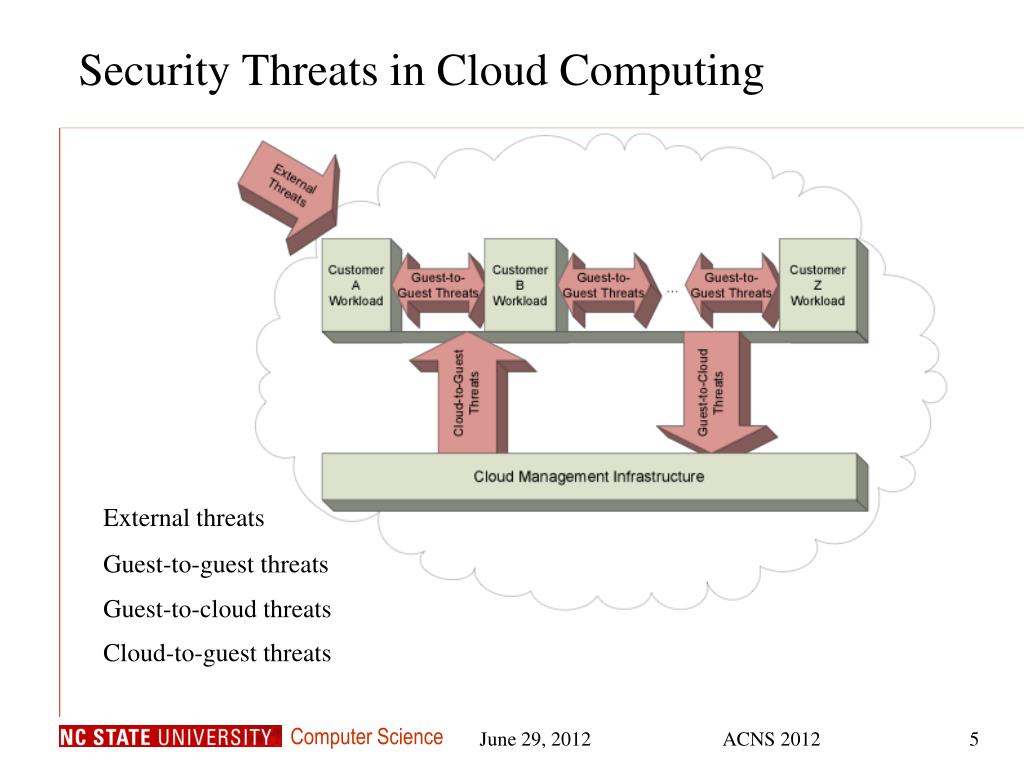 Security Threats in Cloud Computing External threats Guest-to-guest threats Guest-to-cloud threats Cloud-to-guest threats ACNS 2012