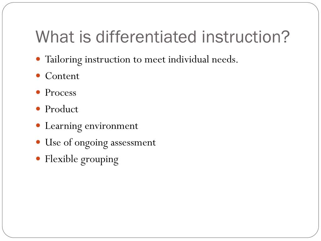 What is differentiated instruction? • Tailoring instruction to meet individual needs. • Content • Process • Product • Learning environment • Use of ongoing assessment • Flexible grouping