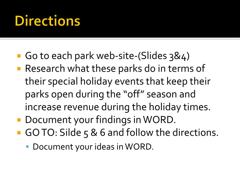 Directions • Go to each park web-site-(Slides 3&4) • Research what these parks do in terms of their special holiday events that keep their parks open during the “off” season and increase revenue during the holiday times. • Document your findings in WORD. • GO TO: Silde 5 & 6 and follow the directions. • Document your ideas in WORD.