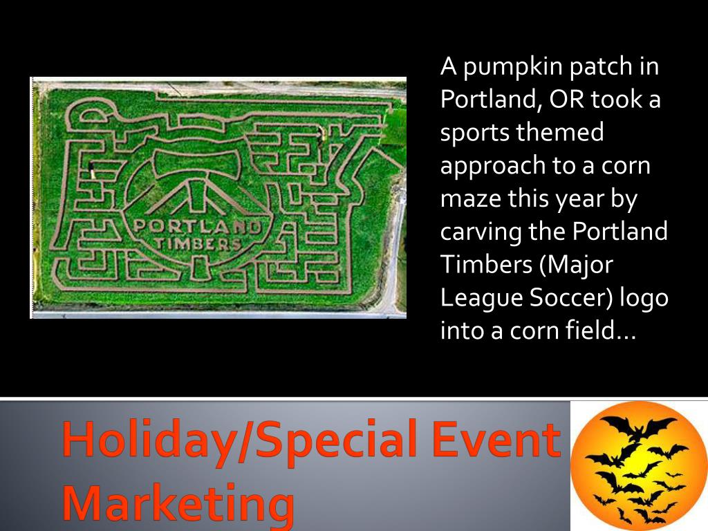 A pumpkin patch in Portland, OR took a sports themed approach to a corn maze this year by carving the Portland Timbers (Major League Soccer) logo into a corn field… Holiday/Special Event Marketing