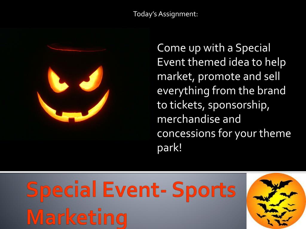 Today’s Assignment: Come up with a Special Event themed idea to help market, promote and sell everything from the brand to tickets, sponsorship, merchandise and concessions for your theme park! Special Event- Sports Marketing
