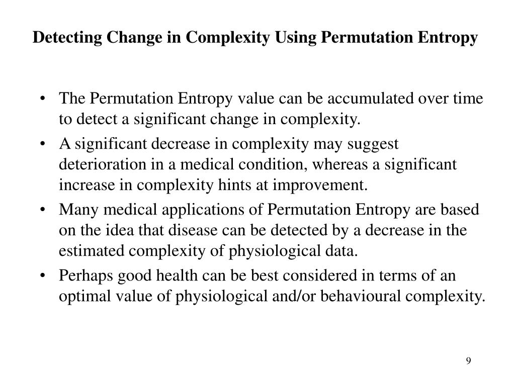 Detecting Change in Complexity Using Permutation Entropy • The Permutation Entropy value can be accumulated over time to detect a significant change in complexity. • A significant decrease in complexity may suggest deterioration in a medical condition, whereas a significant increase in complexity hints at improvement. • Many medical applications of Permutation Entropy are based on the idea that disease can be detected by a decrease in the estimated complexity of physiological data. • Perhaps good health can be best considered in terms of an optimal value of physiological and/or behavioural complexity.