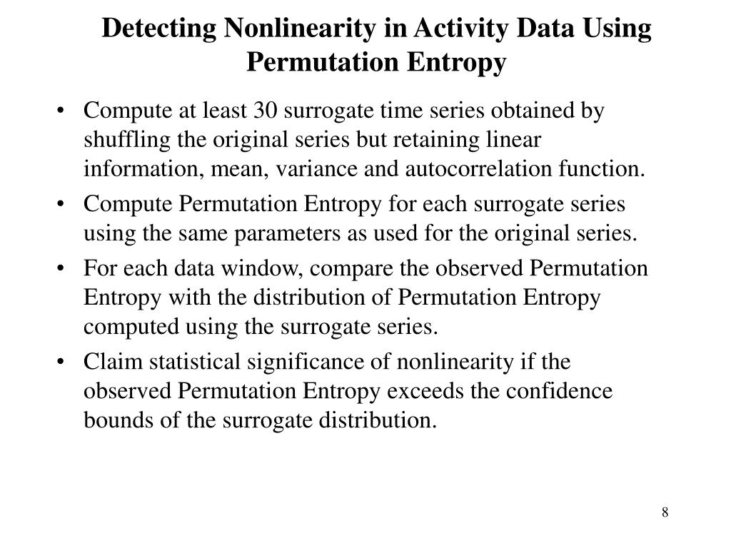 Detecting Nonlinearity in Activity Data Using Permutation Entropy • Compute at least 30 surrogate time series obtained by shuffling the original series but retaining linear information, mean, variance and autocorrelation function. • Compute Permutation Entropy for each surrogate series using the same parameters as used for the original series. • For each data window, compare the observed Permutation Entropy with the distribution of Permutation Entropy computed using the surrogate series. • Claim statistical significance of nonlinearity if the observed Permutation Entropy exceeds the confidence bounds of the surrogate distribution.