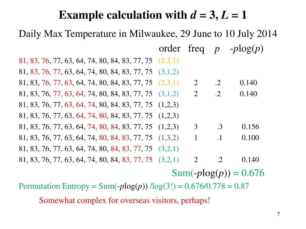 Example calculation with d = 3, L = 1 Daily Max Temperature in Milwaukee, 29 June to 10 July 2014 order freq p -plog(p) 81, 83, 76, 77, 63, 64, 74, 80, 84, 83, 77, 75 (2,3,1) 81, 83, 76, 77, 63, 64, 74, 80, 84, 83, 77, 75 (3,1,2) 81, 83, 76, 77, 63, 64, 74, 80, 84, 83, 77, 75 (2,3,1) 2 .2 0.140 81, 83, 76, 77, 63, 64, 74, 80, 84, 83, 77, 75 (3,1,2) 2 .2 0.140 81, 83, 76, 77, 63, 64, 74, 80, 84, 83, 77, 75 (1,2,3) 81, 83, 76, 77, 63, 64, 74, 80, 84, 83, 77, 75 (1,2,3) 81, 83, 76, 77, 63, 64, 74, 80, 84, 83, 77, 75 (1,2,3) 3 .3 0.156 81, 83, 76, 77, 63, 64, 74, 80, 84, 83, 77, 75(1,3,2) 1 .1 0.100 81, 83, 76, 77, 63, 64, 74, 80, 84, 83, 77, 75(3,2,1) 81, 83, 76, 77, 63, 64, 74, 80, 84, 83, 77, 75 (3,2,1) 2 .2 0.140 Sum(-plog(p)) = 0.676 Permutation Entropy = Sum(-plog(p)) /log(3!) = 0.676/0.778 = 0.87 Somewhat complex for overseas visitors, perhaps!