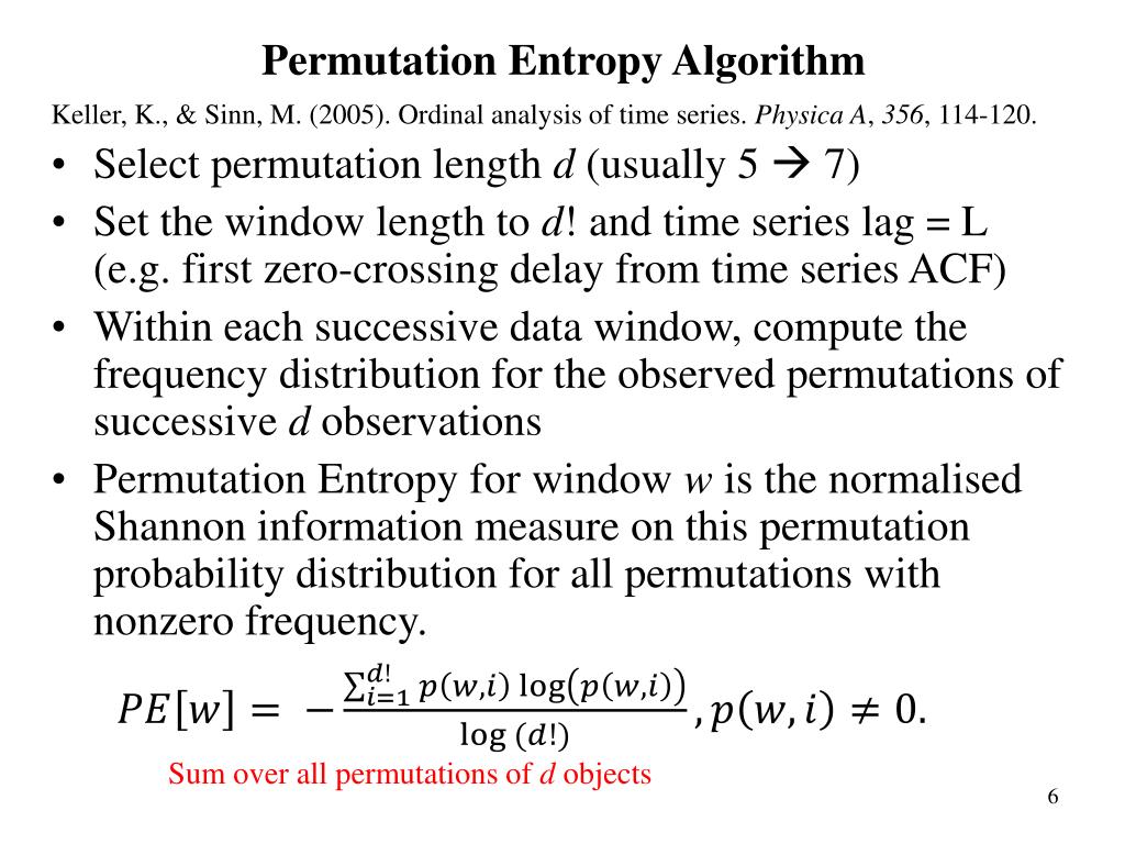 Permutation Entropy Algorithm Keller, K., & Sinn, M. (2005). Ordinal analysis of time series. Physica A, 356, 114-120. • Select permutation length d (usually 5 7) • Set the window length to d! and time series lag = L (e.g. first zero-crossing delay from time series ACF) • Within each successive data window, compute the frequency distribution for the observed permutations of successive d observations • Permutation Entropy for window w is the normalised Shannon information measure on this permutation probability distribution for all permutations with nonzero frequency. Sum over all permutations of d objects