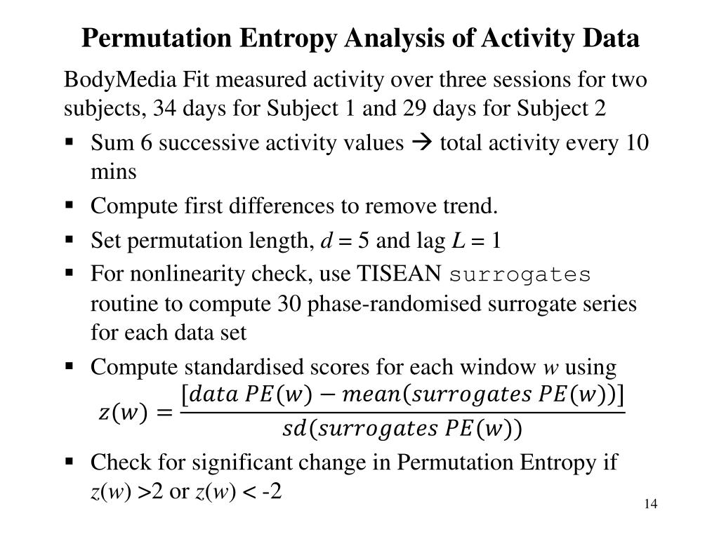 Permutation Entropy Analysis of Activity Data BodyMedia Fit measured activity over three sessions for two subjects, 34 days for Subject 1 and 29 days for Subject 2 • Sum 6 successive activity values total activity every 10 mins • Compute first differences to remove trend. • Set permutation length, d = 5 and lag L = 1 • For nonlinearity check, use TISEAN surrogates routine to compute 30 phase-randomised surrogate series for each data set • Compute standardised scores for each window w using • Check for significant change in Permutation Entropy if z(w) >2 or z(w) < -2