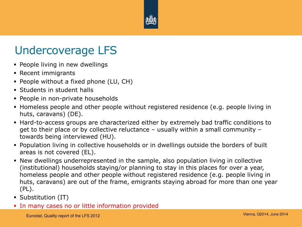 Undercoverage LFS • People living in new dwellings • Recent immigrants • People without a fixedphone (LU, CH) • Students in student halls • People in non-private households • Homeless people and other people without registered residence (e.g. people living in huts, caravans) (DE). • Hard-to-access groups are characterized either by extremely bad traffic conditions to get to their place or by collective reluctance – usually within a small community – towards being interviewed (HU). • Population living in collective households or in dwellings outside the borders of built areas is not covered (EL). • New dwellings underrepresented in the sample, also population living in collective (institutional) households staying/or planning to stay in this places for over a year, homeless people and other people without registered residence (e.g. people living in huts, caravans) are out of the frame, emigrants staying abroad for more than one year (PL). • Substitution (IT) • In many cases no or little information provided Eurostat, Quality report of the LFS 2012