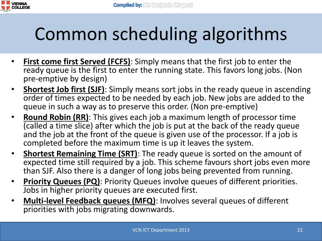 Common scheduling algorithms • First come first Served (FCFS): Simply means that the first job to enter the ready queue is the first to enter the running state. This favors long jobs. (Non pre-emptive by design) • Shortest Job first (SJF): Simply means sort jobs in the ready queue in ascending order of times expected to be needed by each job. New jobs are added to the queue in such a way as to preserve this order. (Non pre-emptive) • Round Robin (RR): This gives each job a maximum length of processor time (called a time slice) after which the job is put at the back of the ready queue and the job at the front of the queue is given use of the processor. If a job is completed before the maximum time is up it leaves the system. • Shortest Remaining Time (SRT): The ready queue is sorted on the amount of expected time still required by a job. This scheme favours short jobs even more than SJF. Also there is a danger of long jobs being prevented from running. • Priority Queues (PQ): Priority Queues involve queues of different priorities. Jobs in higher priority queues are executed first. • Multi-level Feedback queues (MFQ): Involves several queues of different priorities with jobs migrating downwards. VCN ICT Department 2013