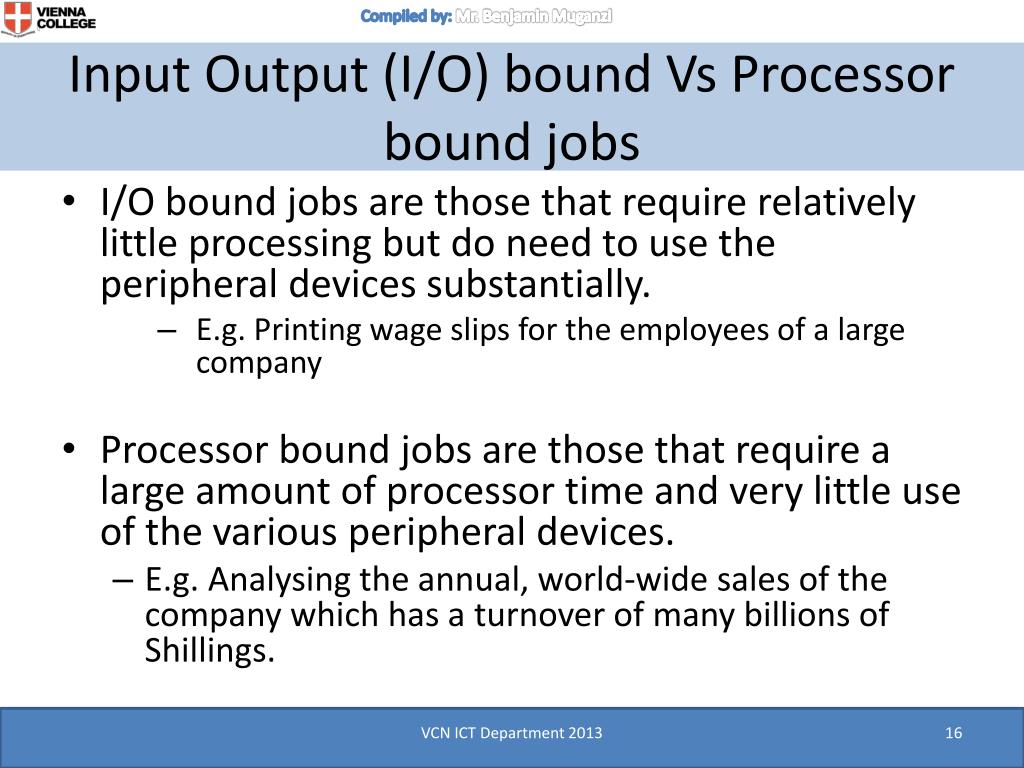 Input Output (I/O) bound Vs Processor bound jobs • I/O bound jobs are those that require relatively little processing but do need to use the peripheral devices substantially. • E.g. Printing wage slips for the employees of a large company • Processor bound jobs are those that require a large amount of processor time and very little use of the various peripheral devices. • E.g. Analysing the annual, world-wide sales of the company which has a turnover of many billions of Shillings. VCN ICT Department 2013