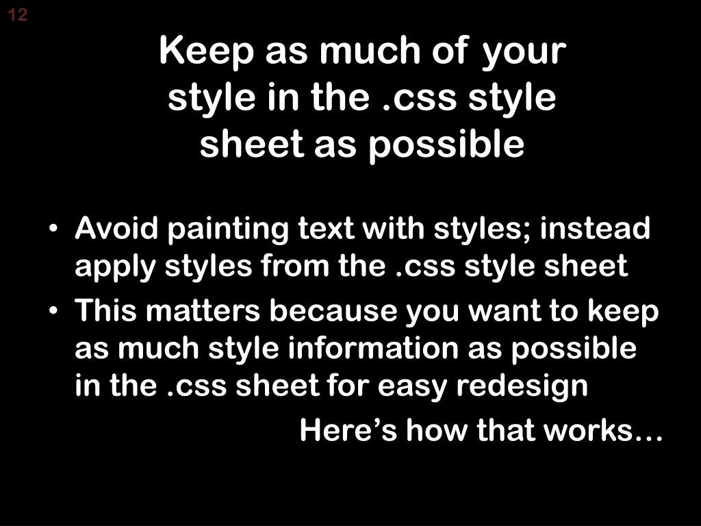 12 Keep as much of your style in the .css style sheet as possible • Avoid painting text with styles; instead apply styles from the .css style sheet • This matters because you want to keep as much style information as possible in the .css sheet for easy redesign Here’s how that works…
