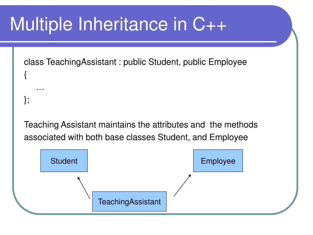 Multiple Inheritance in C++ class TeachingAssistant : public Student, public Employee { … }; Teaching Assistant maintains the attributes andthe methods associated with both base classes Student, and Employee Student Employee TeachingAssistant