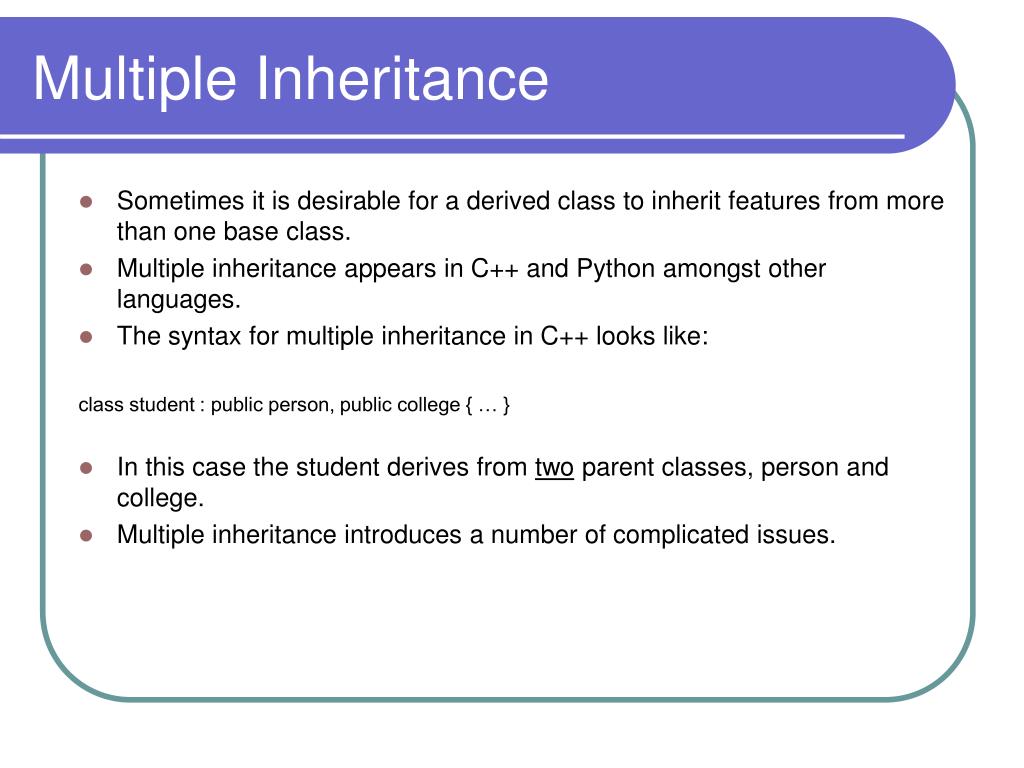 Multiple Inheritance • Sometimes it is desirable for a derived class to inherit features from more than one base class. • Multiple inheritance appears in C++ and Python amongst other languages. • The syntax for multiple inheritance in C++ looks like: class student : public person, public college { … } • In this case the student derives from two parent classes, person and college. • Multiple inheritance introduces a number of complicated issues.